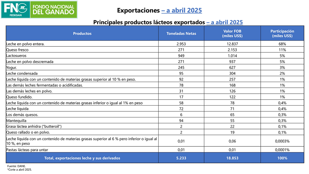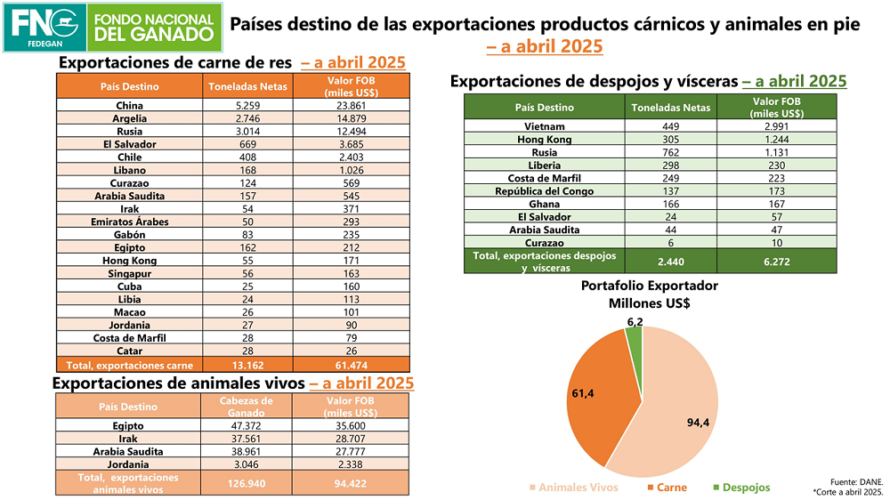 Las exportaciones del sector ganadero colombiano registran cifras históricas durante los primeros cuatro meses de este año con 180,8 millones de dólares y cerca de 30 países como destino, de acuerdo con las cifras del DANE y el análisis de la Oficina de Estudios Económicos de FEDEGÁN.