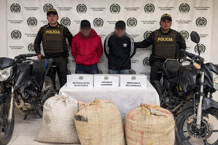 El primer procedimiento se registró en la vereda Nueva Zelanda, finca “Llanitos”, zona rural de Pitalito, donde dos individuos fueron retenidos por la comunidad tras ser sorprendidos con tres tulas de café, equivalentes a 175 kilogramos del grano. La rápida reacción de las autoridades permitió su captura en flagrancia y la incautación de dos motocicletas utilizadas para el transporte del producto.