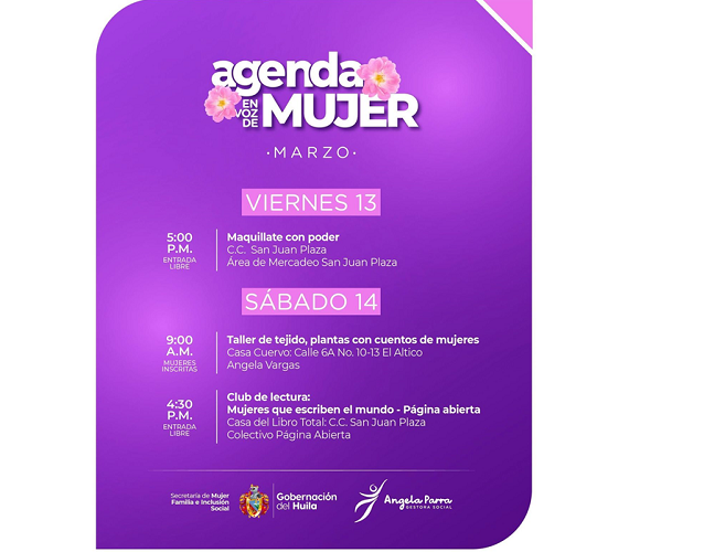 En el Huila celebramos el talento, la memoria y la fuerza de nuestras mujeres con una agenda llena de cultura, arte y bienestar.